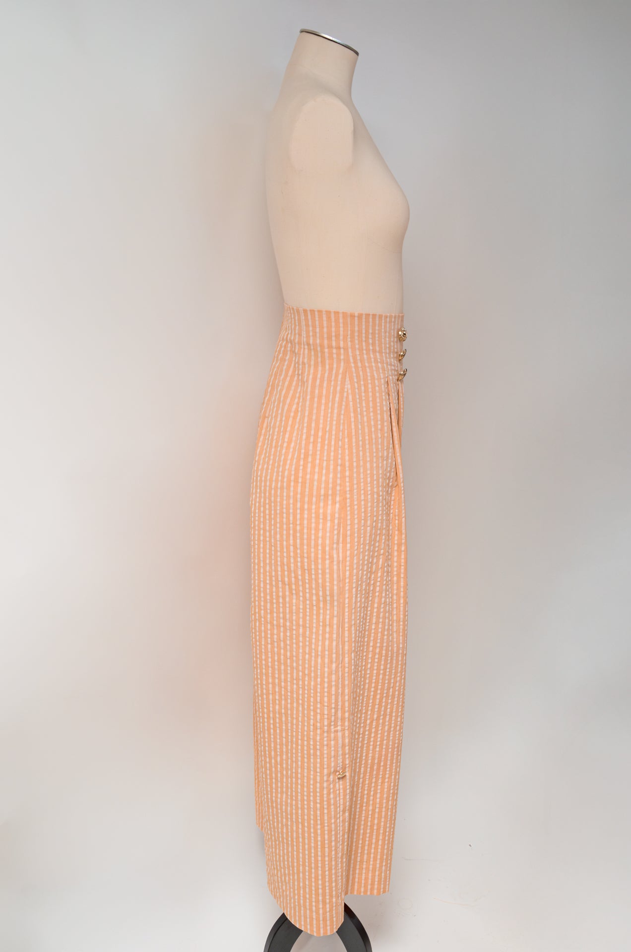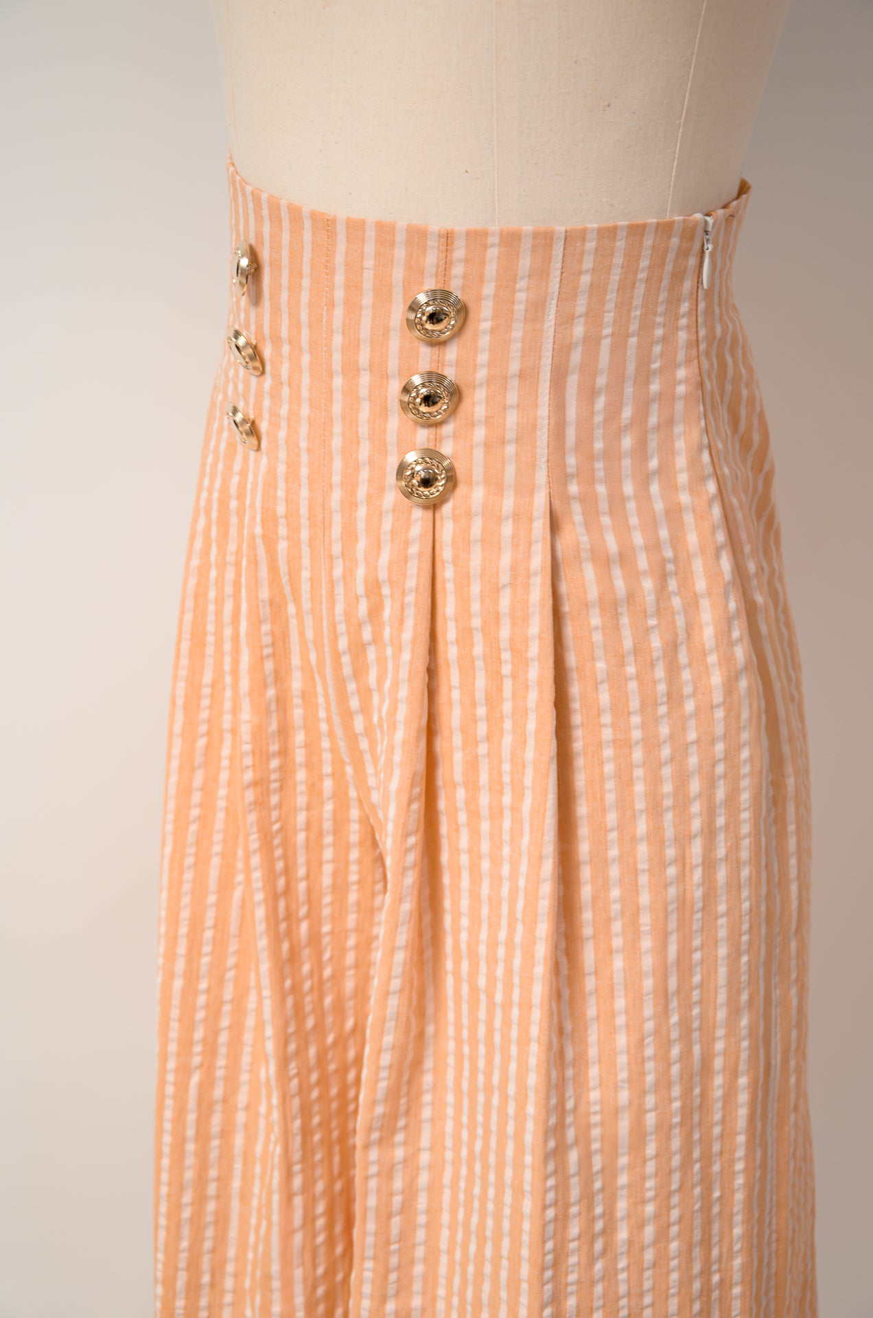 Découvrez notre élégant pantalon large en coton bio seersucker, orné de six boutons dorés à l'avant pour une touche raffinée. Ce modèle ingénieux est doté de pattes intérieures et de deux boutons sur les bas extérieurs, vous permettant de le retrousser facilement. Idéal pour un look décontracté, il s'adapte aussi bien à une journée à la plage qu'à une sortie en ville. Sa taille haute souligne la silhouette et épouse les hanches, tout en offrant une grande aisance de mouvement grâce à sa coupe large. Un incontournable pour allier style et confort !