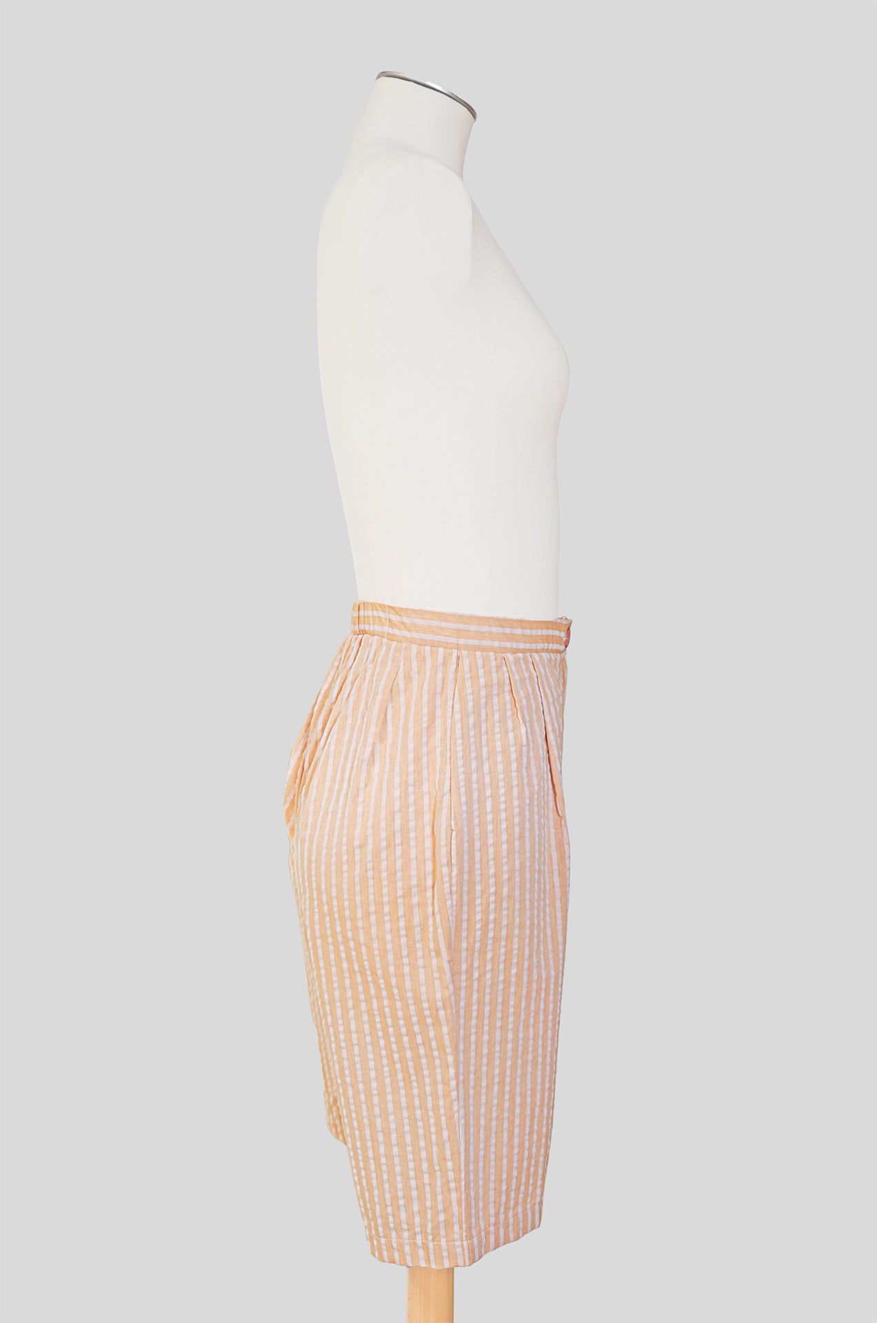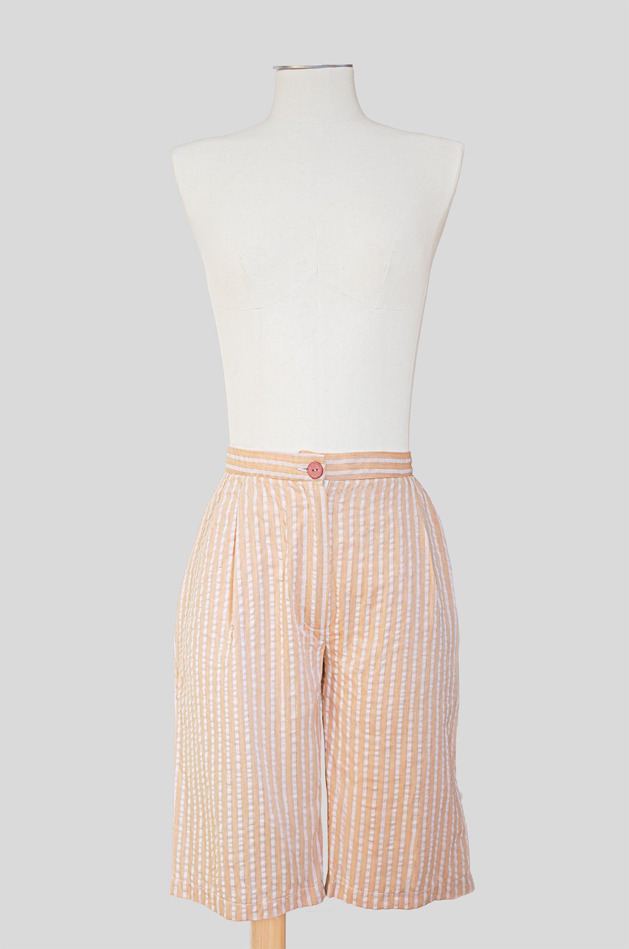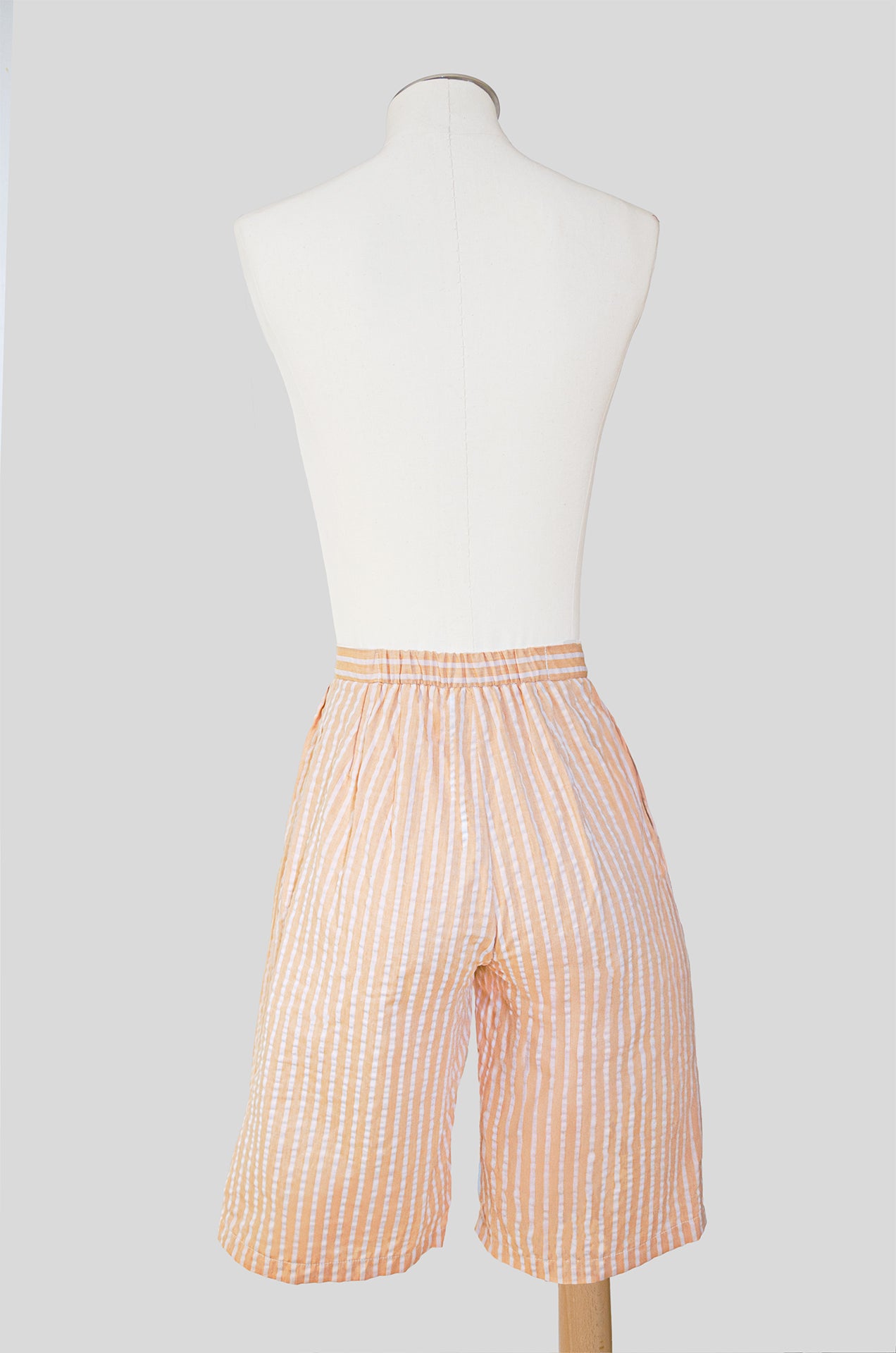 Bermuda au couleurs orangers et sablées en Seersucker (100% coton bio). Il se porte à la plage, comme en ville ; en journée comme en soirée avec la veste Lucia ou autre vêtement de votre choix.